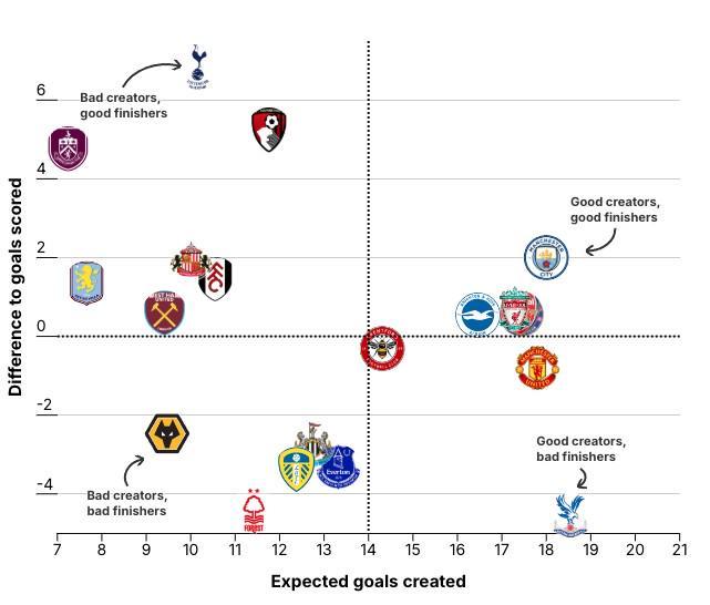 热刺球迷怀念波斯特科格鲁时代的进攻自由,但他因防守糟糕而被解雇。弗兰克被视为能平衡攻防的继任者,以战术智慧和球员培养能力著称。然而,如今的热刺似乎又陷入同样的困局,只是这一次没有了前主席丹尼尔-列维,新的管理层如何应对仍不明确。数据也对弗兰克不利。热刺本赛季进球数比预期高出七球,是英超超额表现最高的球队之一。这意味着他们创造机会有限,只是依靠高效终结撑场。虽然俱乐部10月注入1亿英镑资金,但支出仍无法与顶级豪门匹敌。